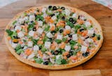 Artichoke hearts, seasoned chicken, black olives & creamy white garlic sauce with mozzarella, red onions & herbs.